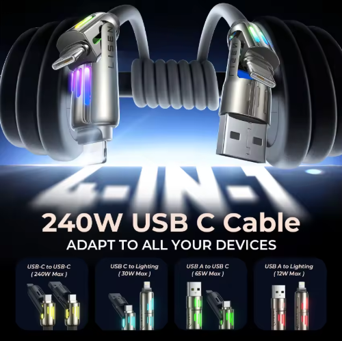 Power up all your devices with the LISEN 4-in-1 USB-C Fast Charging Cable, engineered with advanced PD 3.1 E-Marker technology to deliver up to 240W (48V/5A) high-speed charging. Designed for versatility and durability, this premium cable supports multiple devices and charging standards in one compact solution.